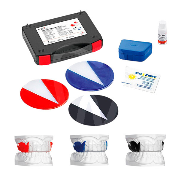 Deep-drawing foils to produce sports mouthguards with integrated reinforcement in the sensitive anterior area. Two materials with different hardness degrees are combined in one deep-drawing foil. The width of the anterior teeth protection can be varied individually due to the V-shape of the harder inlay.
