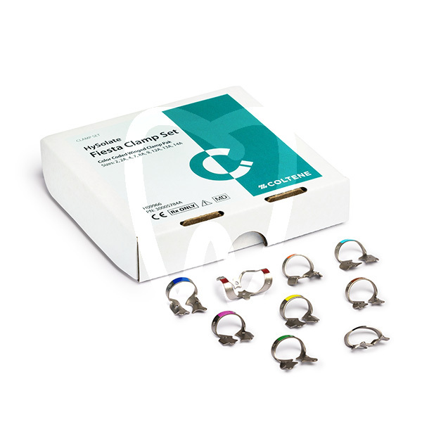 Fiesta® Clamps (Hygenic®). New kit containing the 9 most popular clamps improved with the following characteristics: - Matte finish to avoid bothersome reflections. - Colour-coded clamps for quick and easy identification, simplifying work for the dentist and assistant alike. - Kit with a practical organiser: stainless steel organiser with colour-coded pegs to match each clamp.